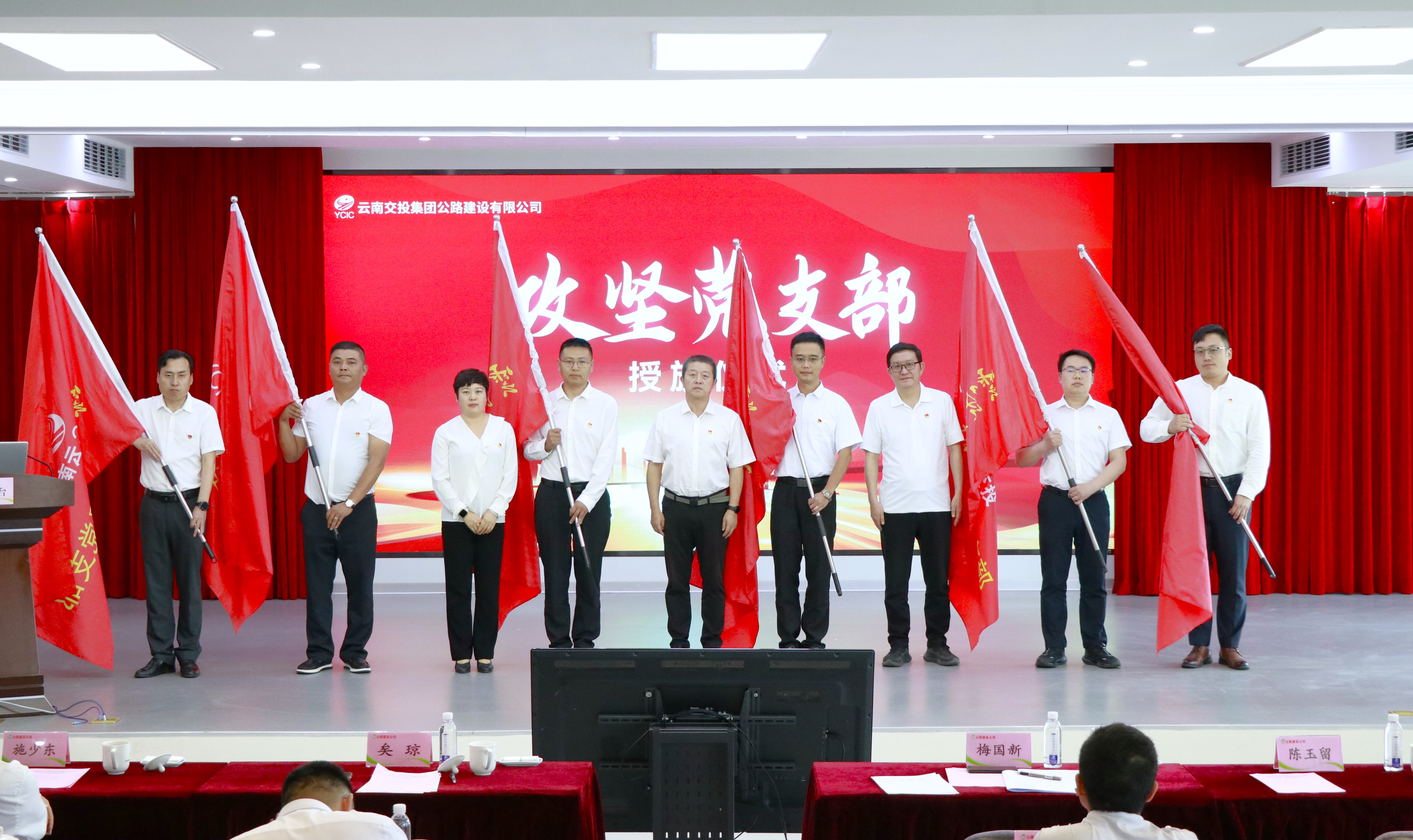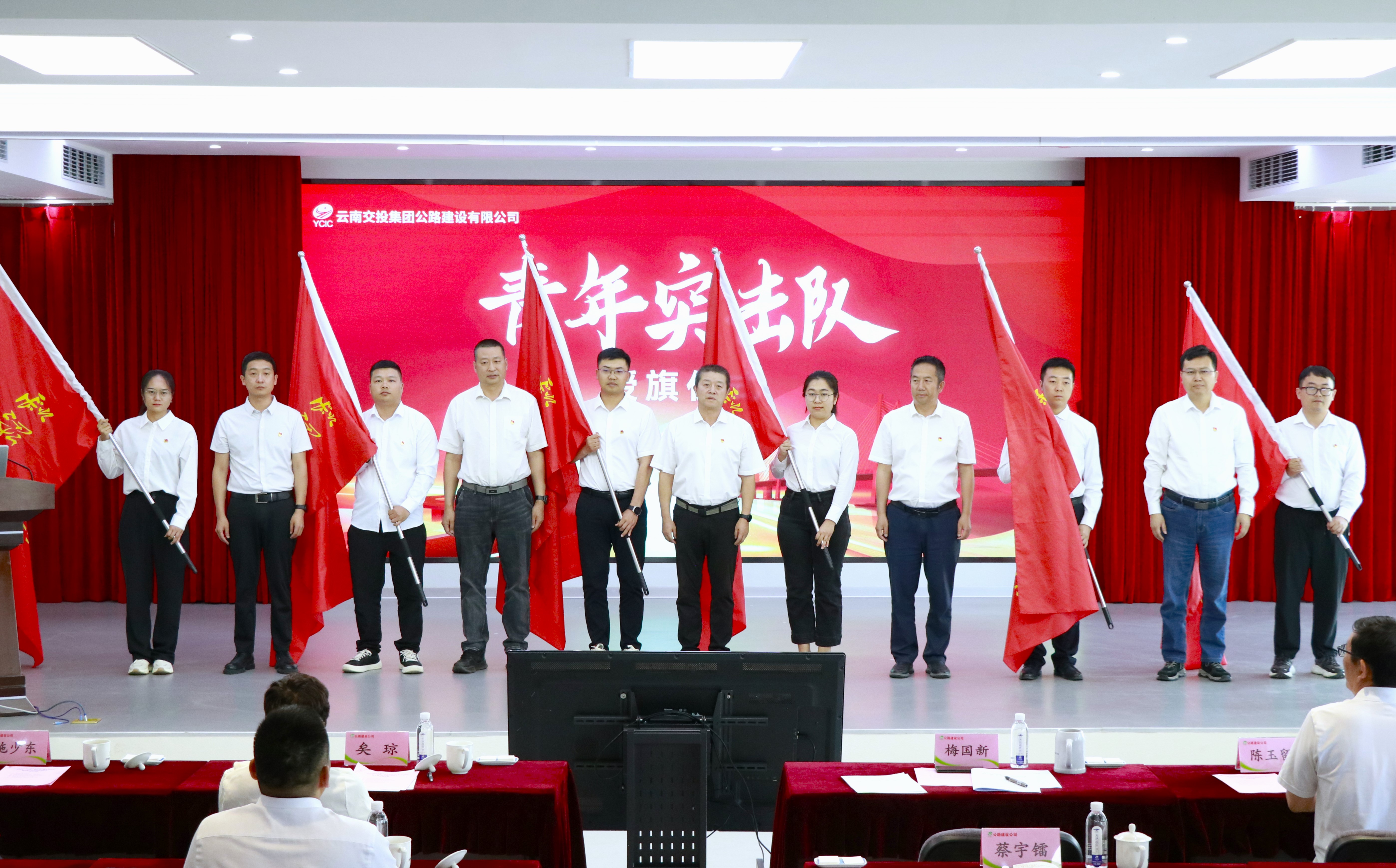 在授旗儀式上,現場氣氛達到高潮,旗幟上的“攻堅黨支部”“青年突擊隊”在燈光下熠熠生輝,象征著責任與使命的傳遞,這些隊伍將帶上旗幟奔赴“硬骨頭”工程一線,在急難險重任務中沖鋒在前,為公司高質量發展貢獻力量。
