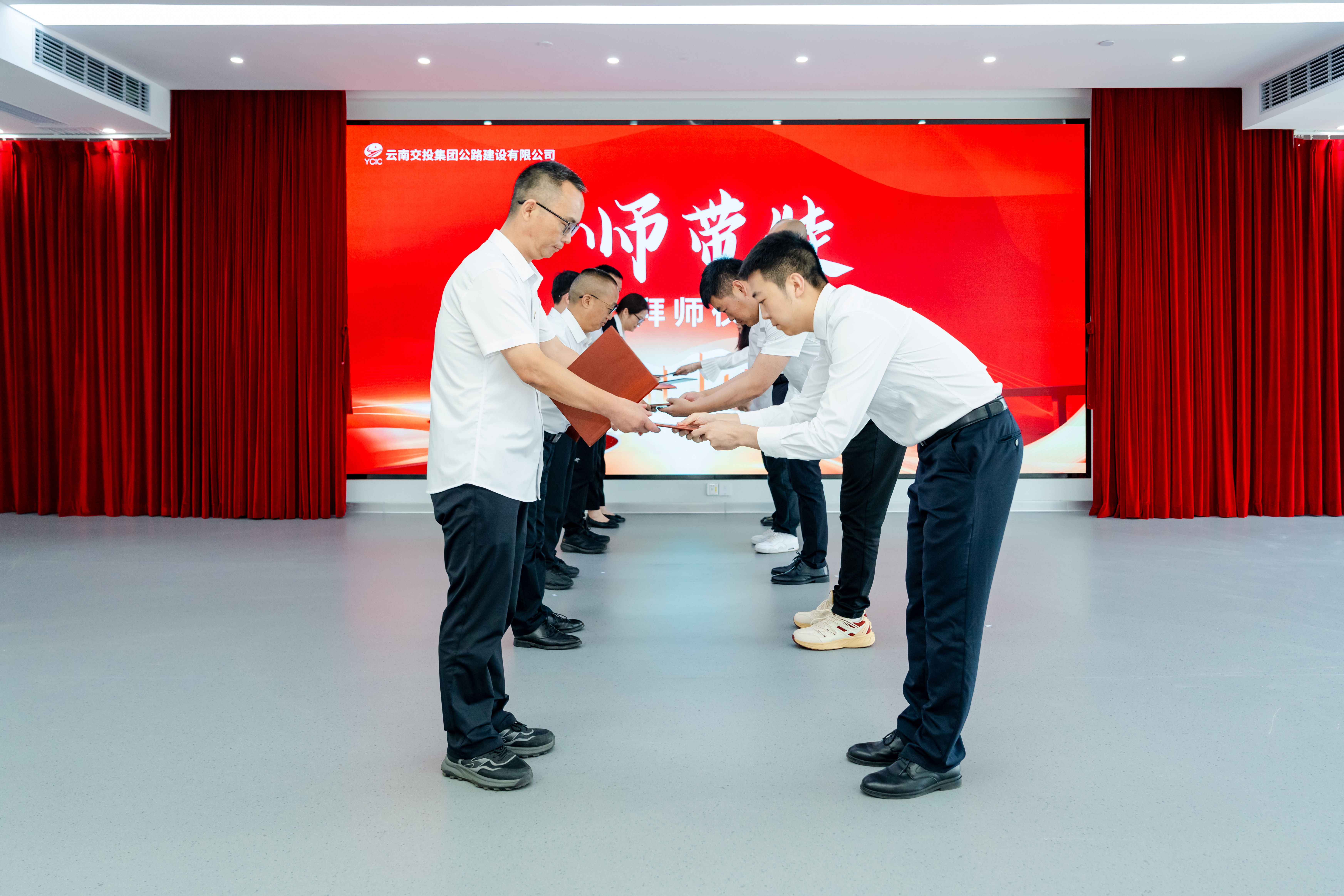 在“師徒對話”微訪談環節,經驗豐富的師傅與朝氣蓬勃的徒弟圍坐暢談,師徒間的思維碰撞,為青年員工點亮前行明燈。隨后舉行的“師帶徒”拜師儀式上,5名青年員工們鄭重地向師傅鞠躬、奉拜師帖,一俯一仰間,承載著匠心傳承、技藝接力的承諾,淬煉出“傳幫帶”的薪火,開啟了新老員工攜手共進的新篇章。